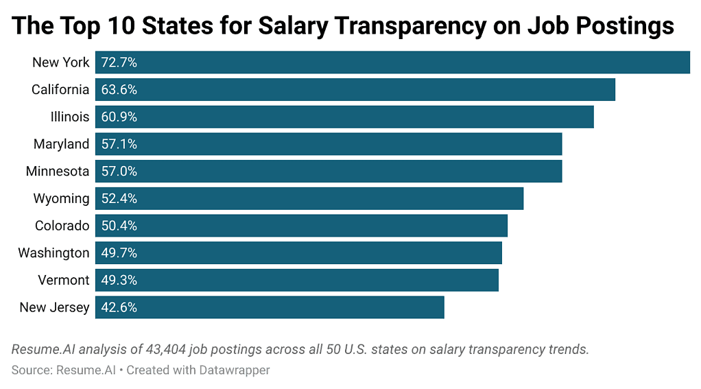 - New York sets an example for salary transparency, with almost 3 in 4 (72.7%) jobs including salary