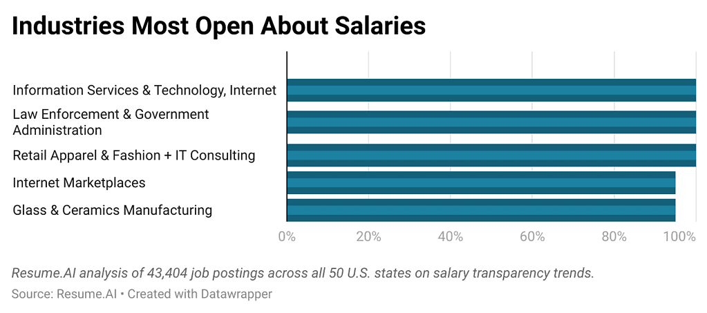 At the top of the ladder, industries like Information Services, Technology, Internet, and even Retail Apparel and Fashion with IT Consulting disclosed pay in every posting, demonstrating that for certain sectors, openness about pay is already expected.