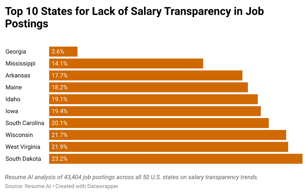 The gap is starkest at the bottom of the rankings. Georgia ranks last, with only 2.6% of job postings showing pay, followed by Mississippi (14.1%), Arkansas (17.7%), Maine (18.2%), and Idaho (19.1%). In these states, fewer than one in five jobs provide salary details, leaving job seekers with little clarity and underscoring how far behind they are compared to the national average of 33.1%.