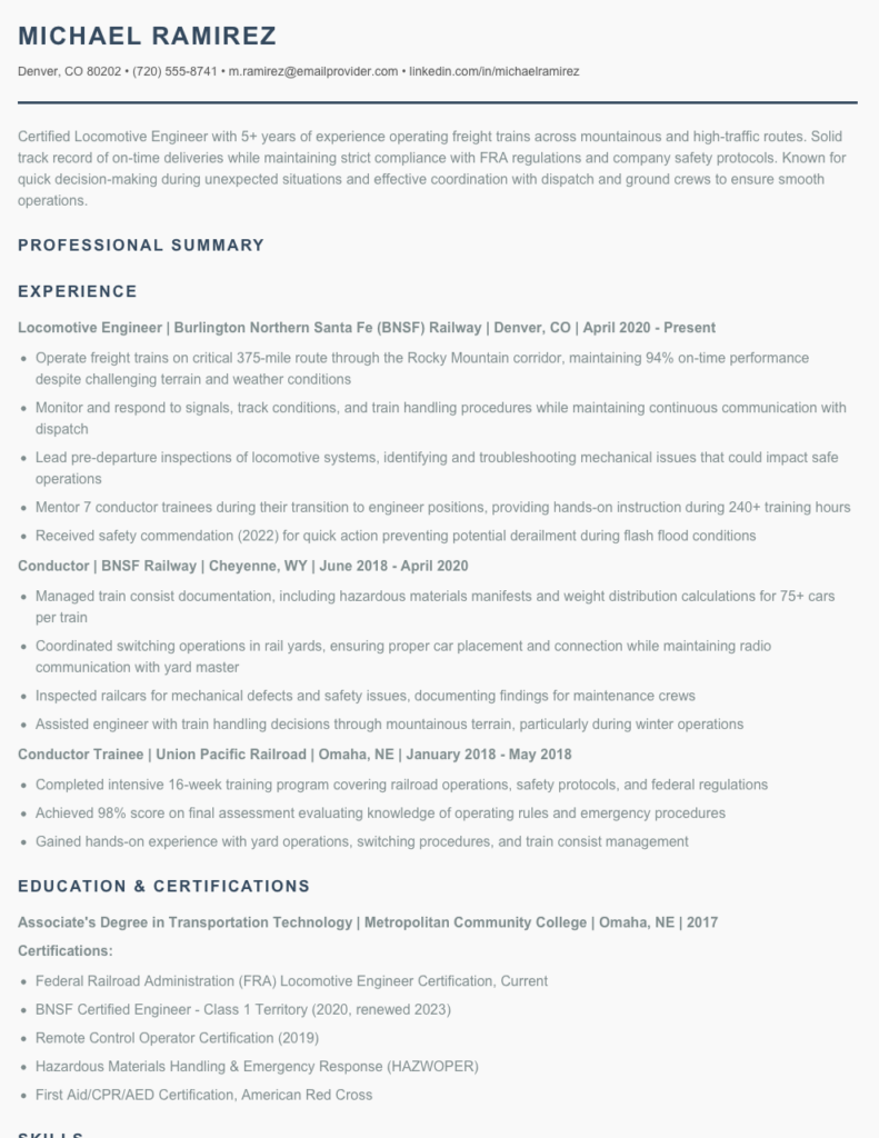 Certified Locomotive Engineer with 5+ years of experience operating freight trains across mountainous and high-traffic routes. Solid track record of on-time deliveries while maintaining strict compliance with FRA regulations and company safety protocols. Known for quick decision-making during unexpected situations and effective coordination with dispatch and ground crews to ensure smooth operations.